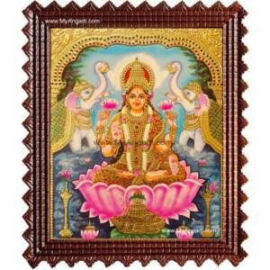 In this aspect, the goddess is depicted seated on a lotus dressed in a red saree, flanked on both side by an elephant (gaja). She is shown as seated in Padmasana yogic posture and has four arms. In each of her upper pair of arms, she carries a lotus, and the lower hands are generally shown in Abhaya mudra and Varada mudra asana.