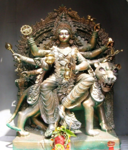 In East India, the last five days of Navratri celebrate Goddess Durga. She is shown riding on a lion (signifying power and “dharma” – righteousness) and holding numerous weapons in her hands (symbolizing the necessity for us to fight our inner demons). Life-size clay idols of Goddess Durga will be created this year on Durgashtami (which will be October 3rd this year). Bengali saris are also worn during this time by women, and they are very exquisite.