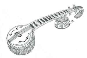 In her front hands, Saraswati plays a musical instrument called Veena. Veena is a string instrument. By playing Veena, it shows that Saraswati is the Goddess of arts, crafts and technology.