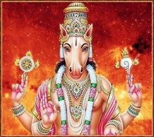 Lord Hayagriva is worshipped as the god of knowledge and wisdom, with a human body and a horse’s head, brilliant white in colour, with white garments and seated on a white lotus. … In several other sources he is a white horse who pulls the sun into the sky every morning.